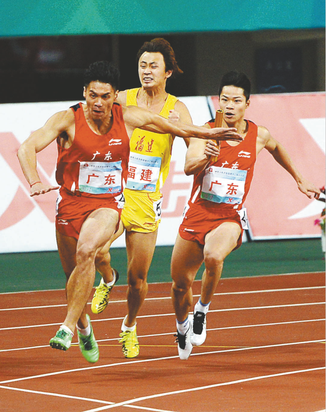 2013年9月11日,中山籍运动员苏炳添(右)与队友在第十二届全运会田径项目男子4×100接力赛夺金牌