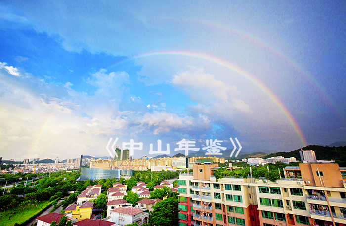 2015年,中山空气优良天数达329天。图为蓝天彩虹映照下的城区