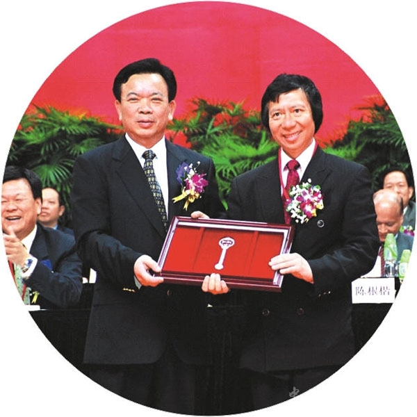 2004年,市长陈根楷(左)向荣誉市民郭炳江颁发证书。