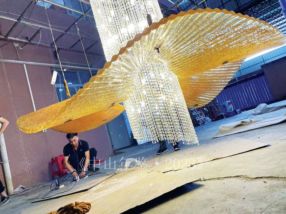 2022年,中山企业中山市华艺灯饰照明股份有限公司为当年世界杯举办城市——卡塔尔新城卢塞尔某五星级酒店提供一盏高约7米、直径约4米的巨型吊灯。图为工人施工现场