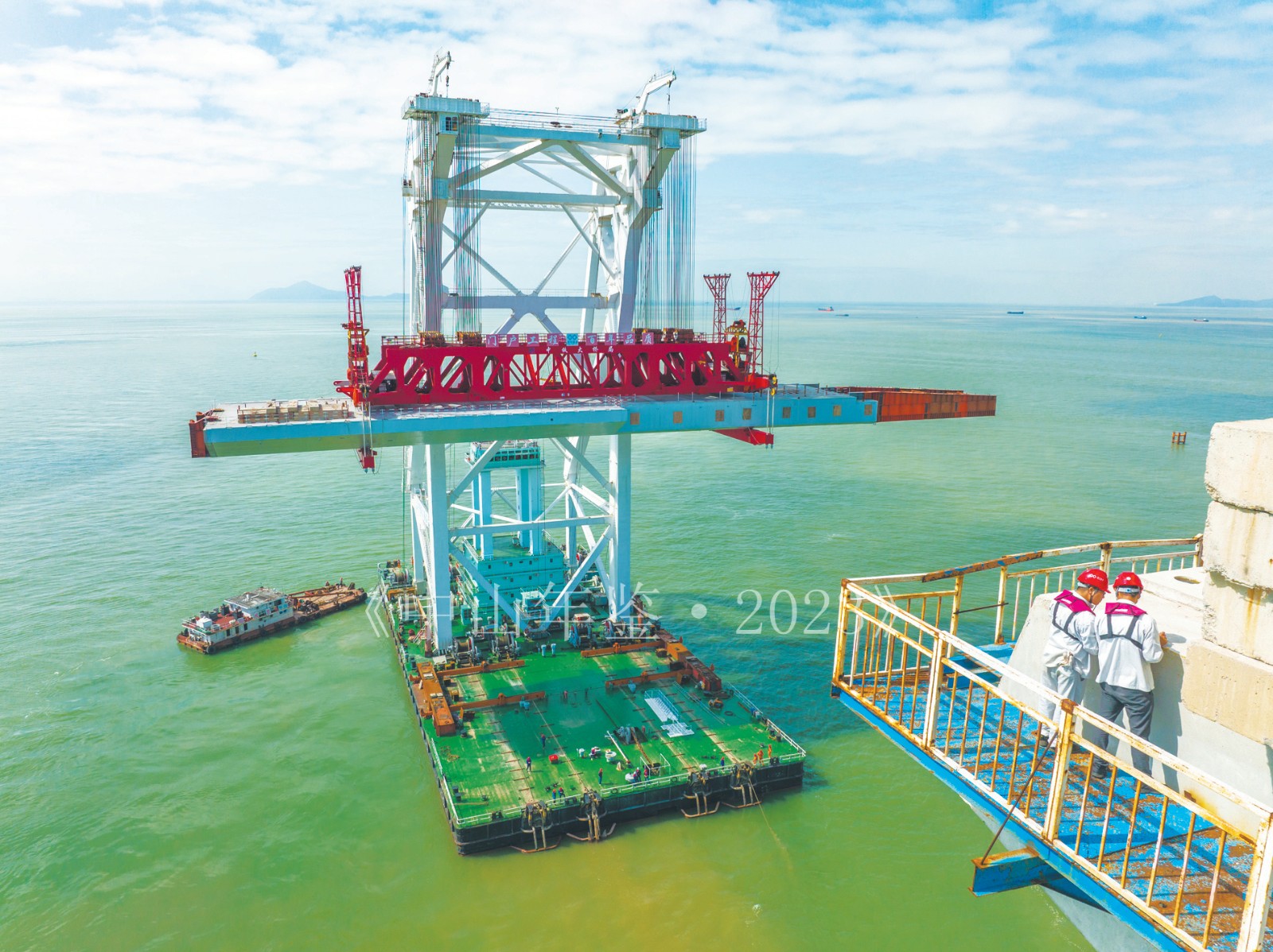 2022年5月17日,深中通道完成海上引桥最高箱梁架设。图为运架一体船“天一号”抵达桥址准备架设