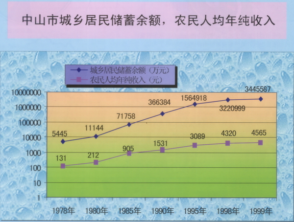 中山市城乡居民储蓄余额,农民人均年纯收入(1978-1999年)